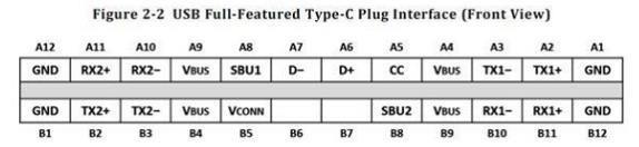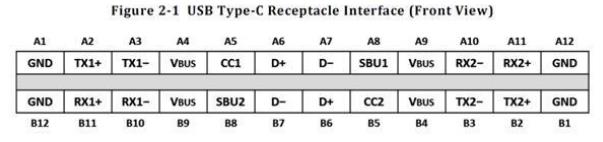 从拆卸上方,USB型C接口有12个引脚,引脚装置如下: